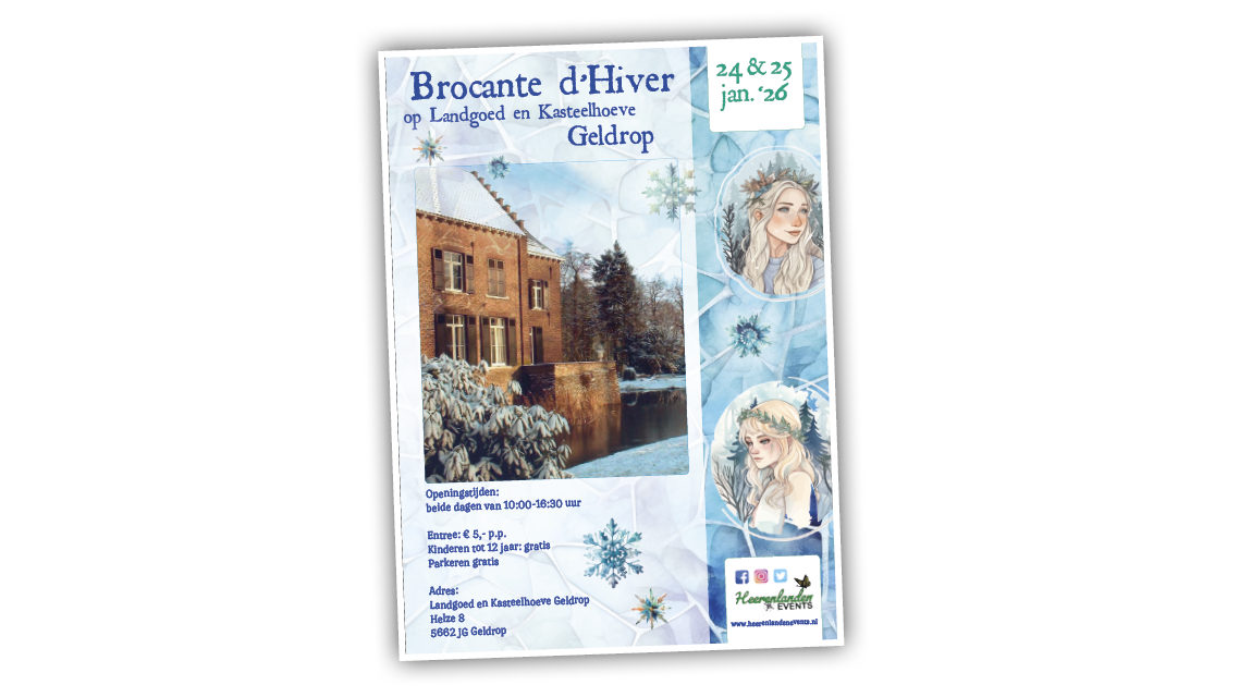 Landgoed en Kasteelhoeve Geldrop is op 24 en 25 januari 2026 het decor voor ‘Brocante d’Hiver’. In de vertrekken van het 17de eeuwse kasteel tonen zo’n 25 handelaren hun mooiste schatten en vondsten uit o.a. Frankrijk, België en Engeland. Ook bent u welkom in de voormalige paardenstal en in de Kasteelhoeve, waar de Pronckzaal en de Oranjerie zijn omgetoverd in een sfeervolle brocante wereld. In de Taveerne staan verse koffie en diverse lekkernijen klaar. Kijk voor meer informatie op heerenlandenevents.nl. Maak 6x kans op twee vrijkaarten voor ‘Brocante d’Hiver’ in Geldrop t.w.v. € 10.