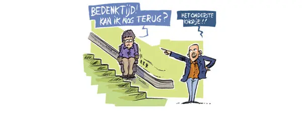 Mevrouw De Jong maakt een afspraak bij een leverancier en binnen korte tijd brengt de verkoper een bezoek bij haar aan huis. Zij tekent uiteindelijk voor akkoord, maar diezelfde avond zit het haar toch niet lekker. Ze voelde zich een beetje onder druk gezet en annuleert de overeenkomst. Tot haar verbazing moet ze dertig procent annuleringskosten betalen. Het ging hier toch om een verkoop buiten een verkoopruimte? Waarom was hier geen sprake van een bedenktijd?
