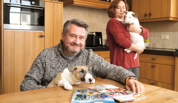 Op de achtergrond vermaken twee jonge speelse bulterriërs zich met elkaar. Tony: “Jeanet is van huis uit kynoloog en fokt eens in de drie tot vier jaar een nieuw stel. Alles volgens de regels en voorschriften van de Raad van Beheer op Kynologisch Gebied in Nederland. Die ziet er ook op toe dat de honden goed terechtkomen.” Jeanet vult aan: “Meer nestjes willen we niet, want ik heb er altijd ontzettend veel moeite mee als de hondjes na acht weken dag en nacht verzorging ons huis verlaten. Dan sta ik echt te janken. De nieuwe eigenaren mogen dan ook nooit meer terugkomen, want daar kan ik niet tegen.”