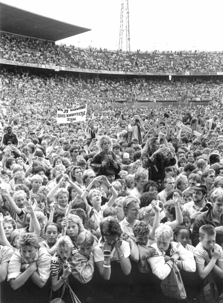 “Op een gegeven moment kreeg ik de kans om het muziekprogramma ‘Los Vast’ te presenteren. ‘Los Vast’ bestond al, maar dat was oubollig met een orkest. Ik werkte toen bij de NCRV achter de schermen. Niet veel later werd Hilversum 3 een popzender en zou het programma bijna de nek omgedraaid worden. Toen heb ik voorgesteld het land in te gaan met ‘Los Vast’. De eerste keer was in Spakenburg en de tweede keer in Krabbendijke. Daar was het zó druk dat ik dacht: wat gebeurt hier? Het waren Beatles-taferelen. Lee Towers vroeg toen: ‘Waarom doe je De Kuip niet?’ Ik zei: ‘Ben je gek geworden?’ Maar Lee hield vol: ‘Gewoon doen.’ Uiteindelijk hebben we De Kuip drie keer met zestigduizend mensen uitverkocht. Het werd via het kanaal Music Box in heel Europa live uitgezonden.”
