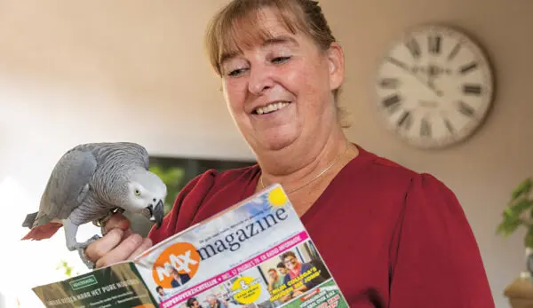 Door haar fysieke problemen – van MS tot een zware rugoperatie – werd zij afgekeurd als ambulancemedewerker. Al die malheur zou menigeen de moed in de schoenen hebben doen zinken. “Maar ik ben gewoon een heel gelukkig mens”, zegt ze opgewekt. “Ik doe alles wat ik kan en leuk vind.” Het gesprek over Renates ervaringen met MAX Magazine wordt instemmend en tamelijk luidruchtig begeleid door haar grijze roodstaartpapegaai Bella, die zich ook nog even bemoeit met het maken van de foto.