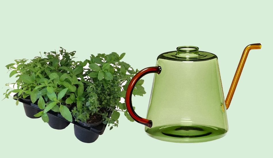 Mooie glazen gieter, zowel praktisch als decoratief. Met inhoud van 1 liter en verkrijgbaar in groen met oranje of in donkergroen met roze. Hübsch Flora Gieter 1 liter (24 cm hoog) voor € 29,99 bij dalivo.nl.